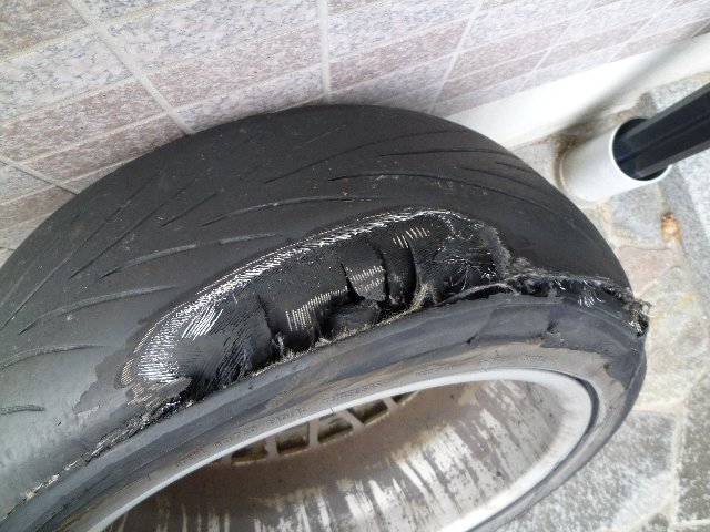 帰ってきてからスペアのタイヤに全部入れ替えたとき、右後のタイヤもバースト寸前なのを発見。