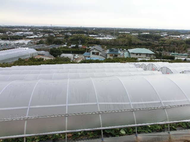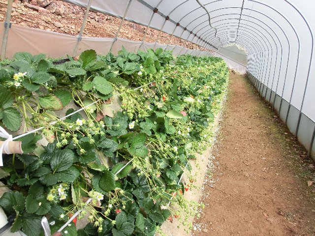 こんな感じのハウスの中に石垣のようなものが出来ていて、そこの隙間にイチゴが植えてあって収穫したものをその場で食べるという。