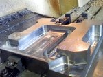 底面ピン角の5度テーパ壁面加工、いままでの3軸マシニングセンタであれば途中までボールエンドミルで等高線加工して、底面に残った隅Rを小さいRのラジアスエンドミルで細かいピッチで等高線加工し、最後にフラットエンドミルで超細かいピッチで等高線加工するという、なんとも時間のかかるやり方をします。