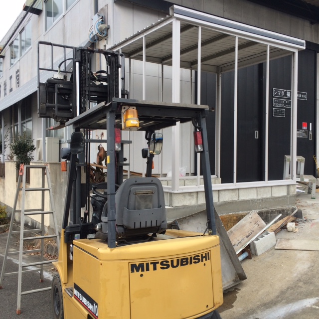 シャッターの取付けが高いところに重いものを持ち上げて小さな穴にスライドインする組立てだったので大変でしたが、フォークリフトのパワーでなんとかなりました。