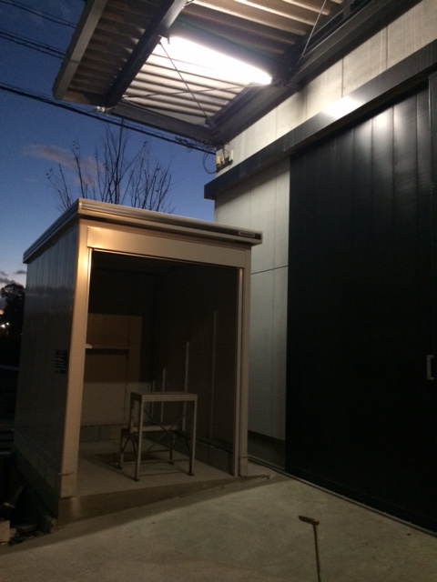 コンクリート壁で建物つくると大げさなので、物置きにしました。