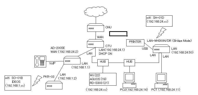 うちのネットワーク図ではないのですが、こんな感じで社内LANはCTU以下のローカルIPアドレス 192.168.24.xxで構築されており、ひかり電話のほうはVoIP以下のローカルIPアドレス 192.168.1.x のほうにWiFiルータをぶら下げてつながっています。
