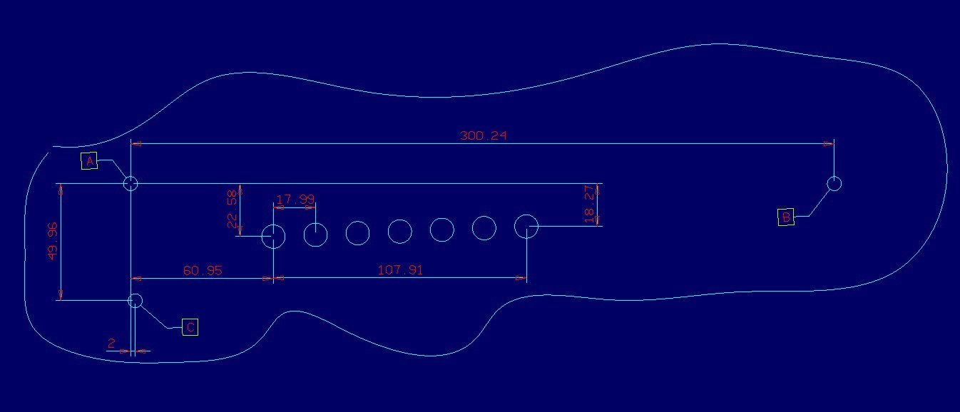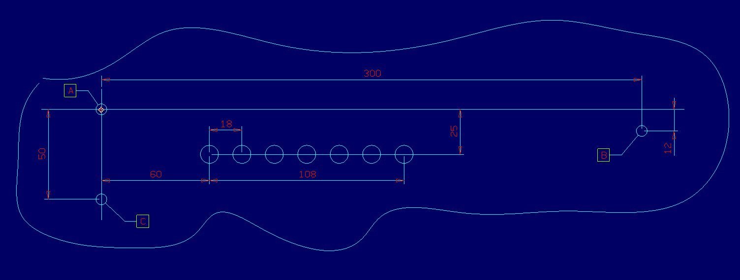 しかたがないので基準穴である-A- -B- -C-の穴位置を使って直線で結び、それを使って測定することにしました。