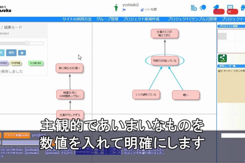 まったくの無知識な状態から、私が作った動画マニュアルを見ただけで現状問題構造ツリーを作り始めたのですが、非常にうまくツリーが出来ていて、動画マニュアルはけっこう役にたつんだということを証明してくれました。