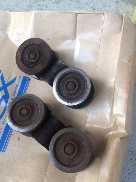 左下がこれから交換するステンレス製の滑車、右上が間違えて?持ってきた一番安いヤツの滑車。