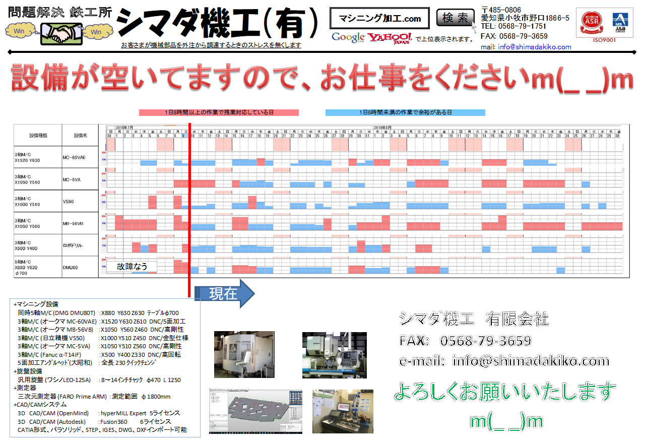 シマダ機工はわけあって生産技術の能力が高い(と自負しています)ので、技術サポート、スケジュールと品質などの管理体制はシマダ機工がしっかりと面倒をみて、協力会社さまと連携してお客さまの部品調達をお手伝いするという感じで行きたいと思います!