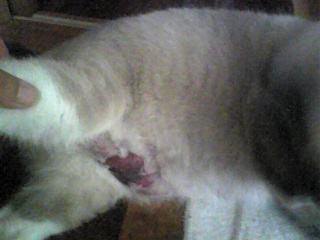 お医者さん的には他のネコとケンカしたら、下腹部オンリーでケガをするとことはありえないので、マムシとかキントキにかまれたんじゃないかとのこと。
